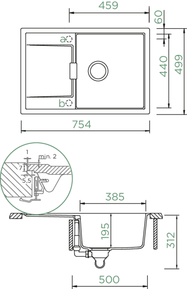 - Breite Hauptbecken in mm: 440